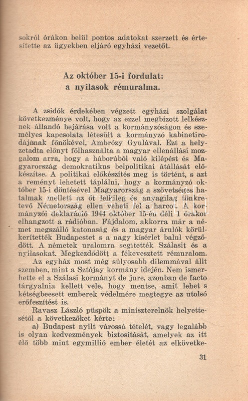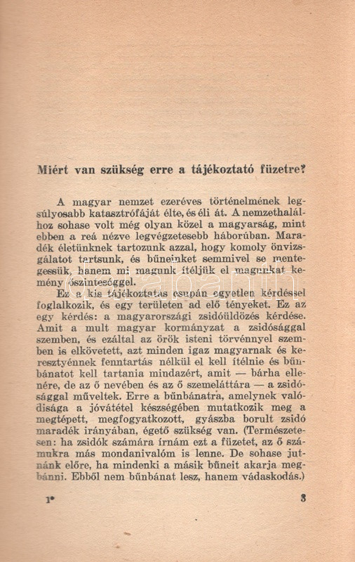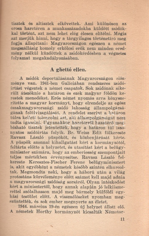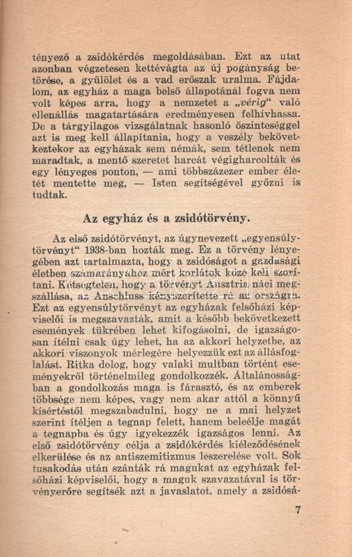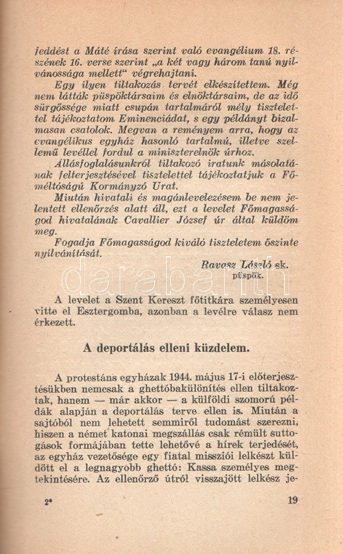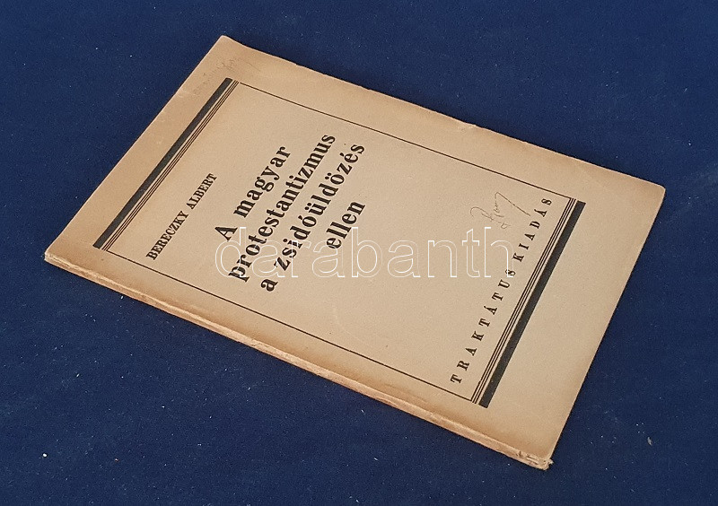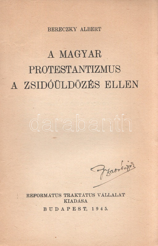 Bereczky Albert: A magyar protestantizmus a zsidóüldözés ellen. Budapest, 1945. Református Traktátus Vállalat (Sylvester Rt. ny.) 44 + [4] p. ElsÅ‘ kiadás. Bereczky Albert (1893-1966) református lelkész, késÅ‘bbi református püspök összefoglalója a magyar nemzetet ért legsúlyosabb csapásnak tekinti a második világháború korát, ezen belül pedig külön kiemeli a zsidóüldözés rémtetteit, illetve a református egyház lehetÅ‘ségekhez mért, mégis bátor kiállását a zsidóüldözés ellen - a kötet az általános politikai áttekintés után a református egyház állásfoglalásait, nyÃlt leveleit, tiltakozásait teszi közzé. A cÃmoldalon és az elsÅ‘ borÃtón régi tulajdonosi bejegyzés. Fűzve, feliratozott, sérült, javÃtott kiadói borÃtóban.