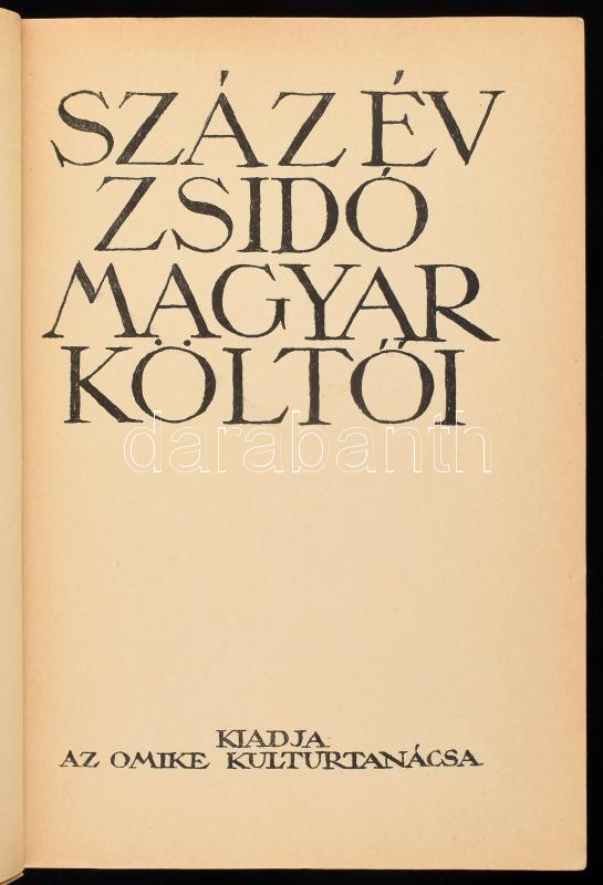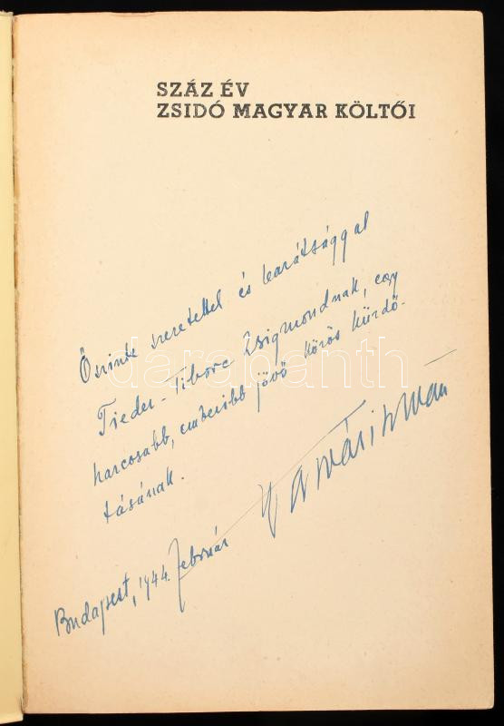 Csergő Hugó (szerk.): Száz év zsidó magyar költői. H.n., OMIKE. Tieder Zsigmond (1887-1979) írónak címzett ajándékozási sorokkal. Kiadói papírkötés, kopottas állapotban.