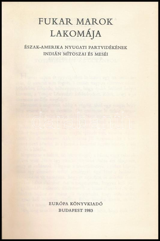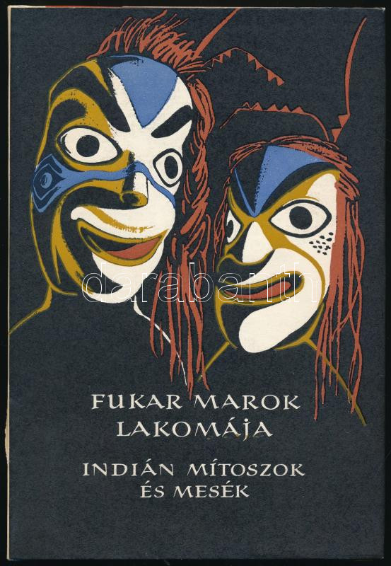 Fukar marok lakomája. Észak-Amerika nyugati partvidékének indián mítoszai és meséi. Népek meséi sorozat. Vál. és az utószót írta: Borsányi László. Ford.: Ignácz Rózsa. Bp.,1983,Európa. A könyv borító illusztrációja és az illusztrációk Lóránt Lilla munkái. Kiadói félvászon-kötés, kiadói papír védőborítóban jó állapotban.