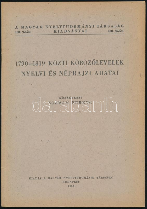 Schram Ferenc: 1790-1819 közti körözőlevelek nyelvi és néprajzi adatai. Magyar Nyelvtudományi Társaság kiadványai 108. Bp., 1964, Magyar Nyelvtudományi Társaság, 54+6 p. Kiadói papírkötés. Hollós Attila (1933-2023) nyelvész részére szóló számlával.