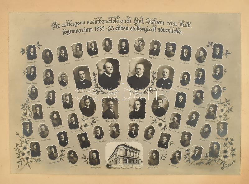 1933 Az esztergomi Szent Benedek rendi Szt. István róm. kath. főgimnázium 1932-1933-ban érettségizett növendékei, tablófotó, kartonra kasírozva, 18×26 cm