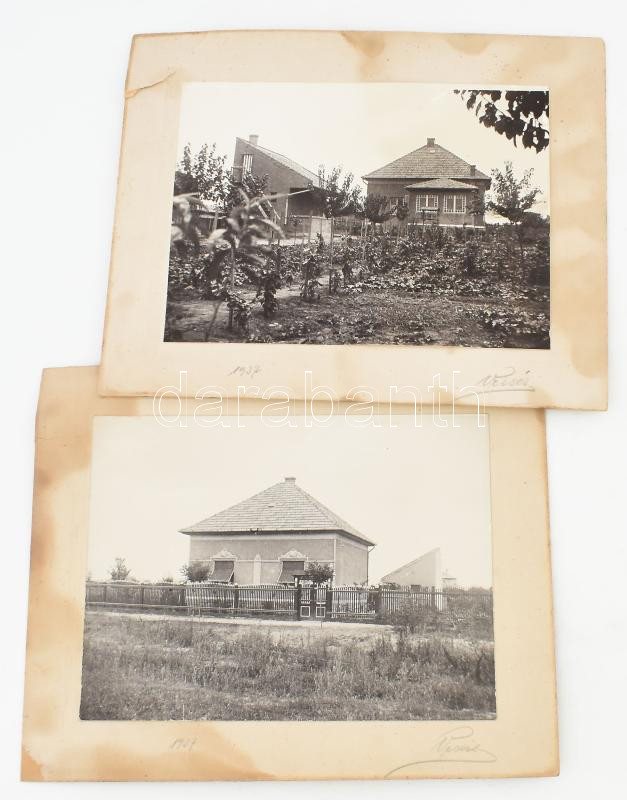 1937 Vecsés, kertes házak, 2 db nagyméretű, kartonra kasírozott fotó, jelzettek, a karton szélén foltokkal, egyiken kisebb felületi hibával, 23,5x17,5 cm körül