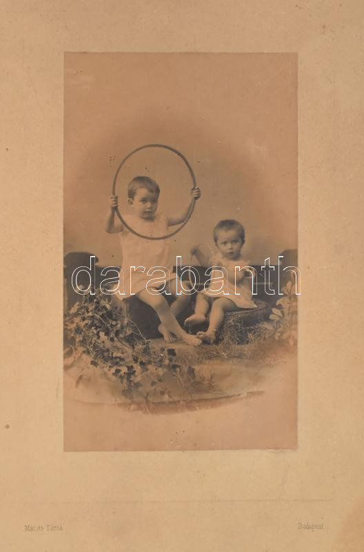 cca 1890-1900 Kisgyermekek karikával (a hátoldali felirat szerint Gajáry István és Kálmán), kartonra kasírozott fotó Mai és Társa budapesti műterméből, kissé sérült, ázásnyommal, 18x10,5 cm (karton: 33x24 cm)