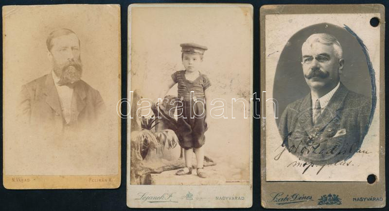 cca 1890-1910 Vegyes fotó tétel, nagváradi fotósok műterméből, 3 db., az egyik nevesített (Pezold Mór 1905), a másikon aláírással, változó állapotban, az egyik felső széle vágott, közte foltos, 10x6 cm és 9x6 cm