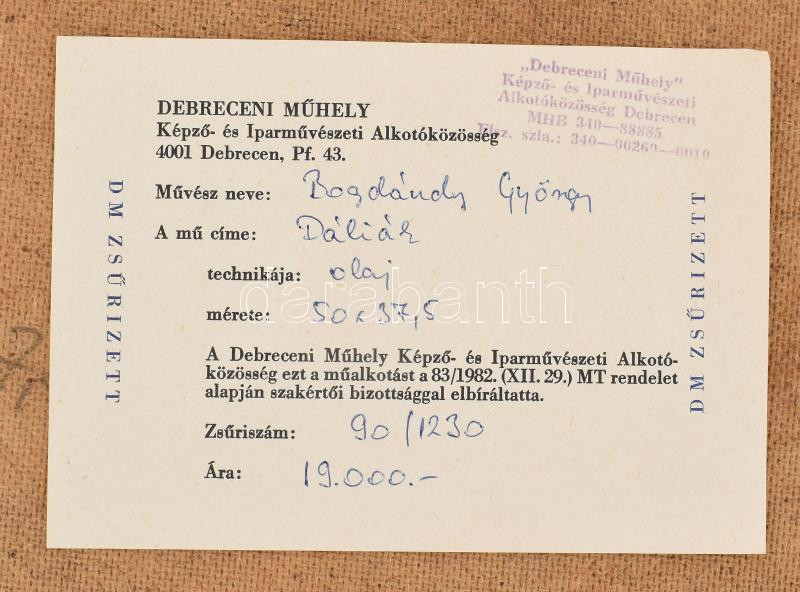 Bogdándy György (1932-): Dáliák. Olaj, farost. Jelzett, hátoldalán cím... https://www.darabanth.com/de/475-Fernauktion/475.0/Gemalde-und-Grafiken/Gemalde-und-Grafiken~500002/Bogdandy-Gyorgy-1932-Daliak-Olaj-farost-Jelzett-hatoldalan-cimken-feliratozott-50x3~II3228801