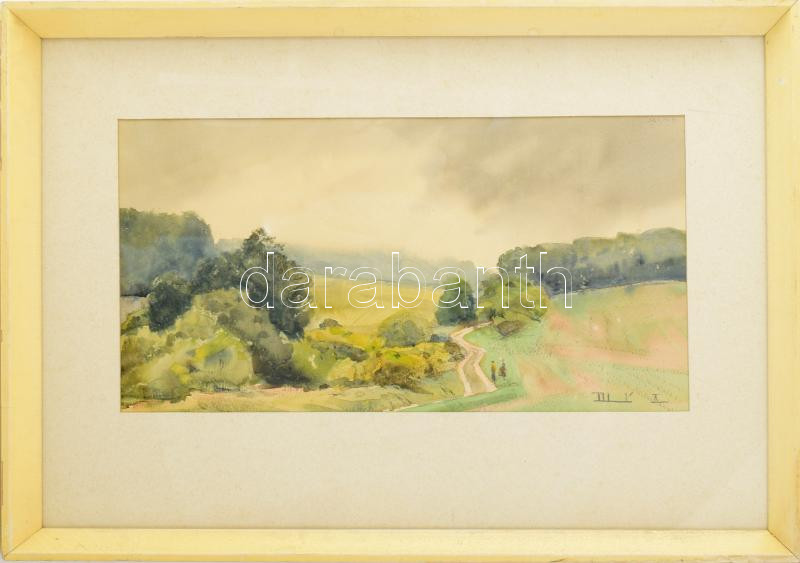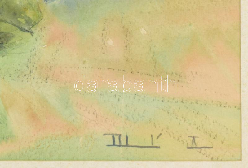 Beschreibung: Dobroszláv Lajos (1902-1987): Borús idő. Akvarell, papír, jelezve jobbra lent, üvegezett keretben, hátoldalán Képcsarnok Vállalat címkéjével, 23×44 cm.