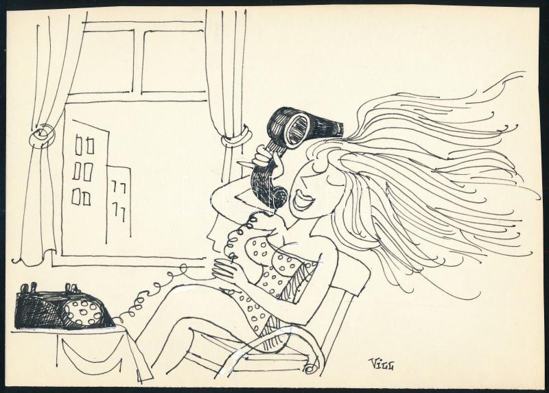 Földes Vilmos (1942-): Telefonos kisasszony (karikatúra, cím nélkül). ... https://www.darabanth.com/de/475-Fernauktion/475.0/Gemalde-und-Grafiken/Gemalde-und-Grafiken~500002/Foldes-Vilmos-1942-Telefonos-kisasszony-karikatura-cim-nelkul-Tus-papir-jelzett-15C3~II3192537