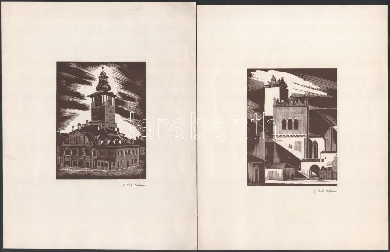 Beschreibung: Gáborjáni Szabó Kálmán (1897-1955): Brassó - Városháza és Nagyenyed, 2 db fametszet, papír, jelzett a metszeten, 13x10 cm