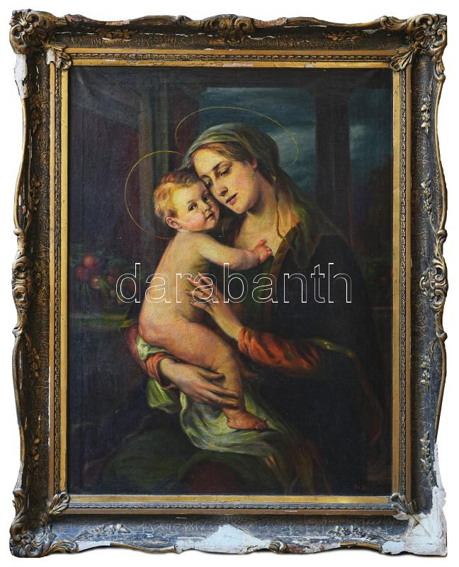 Harmann Béla (-), másolat ismeretlen festő után, XX. sz. eleje: Mária a kisdeddel. Olaj, vászon. Jelzett. Dekoratív, sérült fakeretben, 93×71 cm. KIZÁRÓLAG SZEMÉLYES ÁTVÉTEL, NEM POSTÁZZUK / ONLY PERSONAL COLLECTION IN OUR OFFICE!