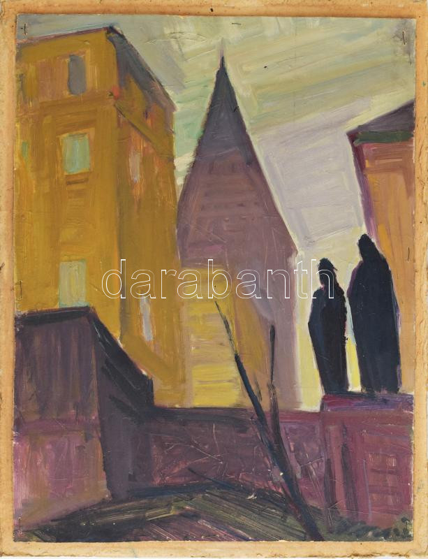 Beschreibung: Koncz Zoltán (1915 - 1995) Templomkert (Árpád kor). Olaj, papír, apró felületi kopásokkal 47x35 cm Hátodalán autográf felirattal