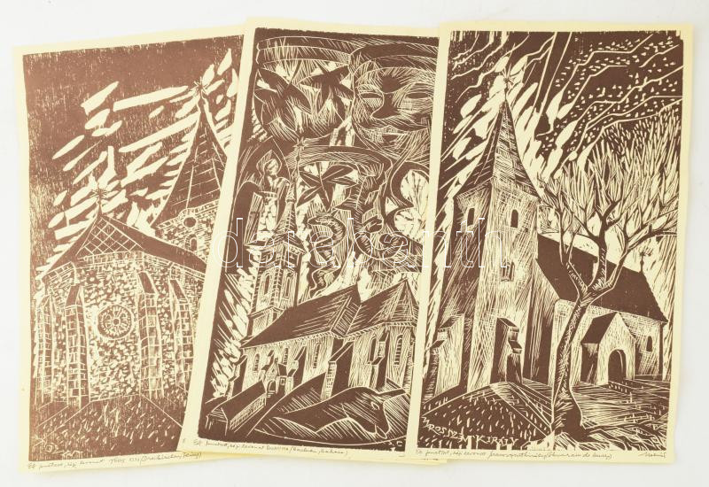 Beschreibung: Molnár Dénes (1947-2000): 4 db erdélyi témájú ábrázolás (Déva, Bonyha, Tövis, Marosszentkirály). Nyomat, papír, jelzett a nyomaton. 45x25 cm körüli méretekben.