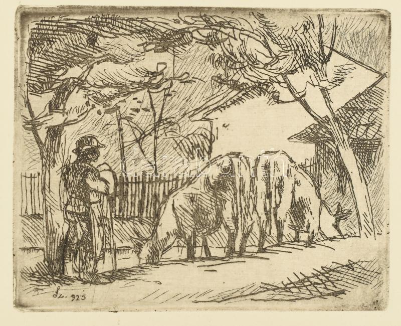 Beschreibung: Szőnyi István (1894-1960): Pásztor. Rézkarc, papír, jelzett a karcon, hátoldalán Palota Galéria bélyegzőjével, 8×10 cm