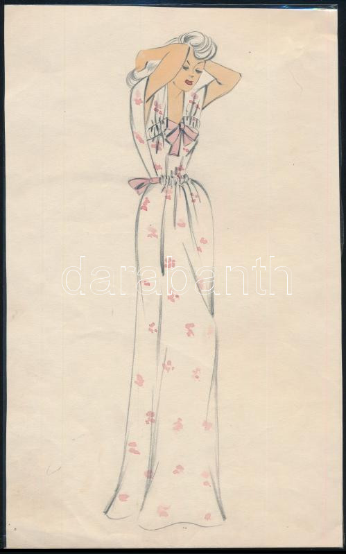 Beschreibung: Dr. Fehérné Varga Ágnes divatrajz, ceruza, akvarell, papír, hátoldalán jelezve, 29x18 cm