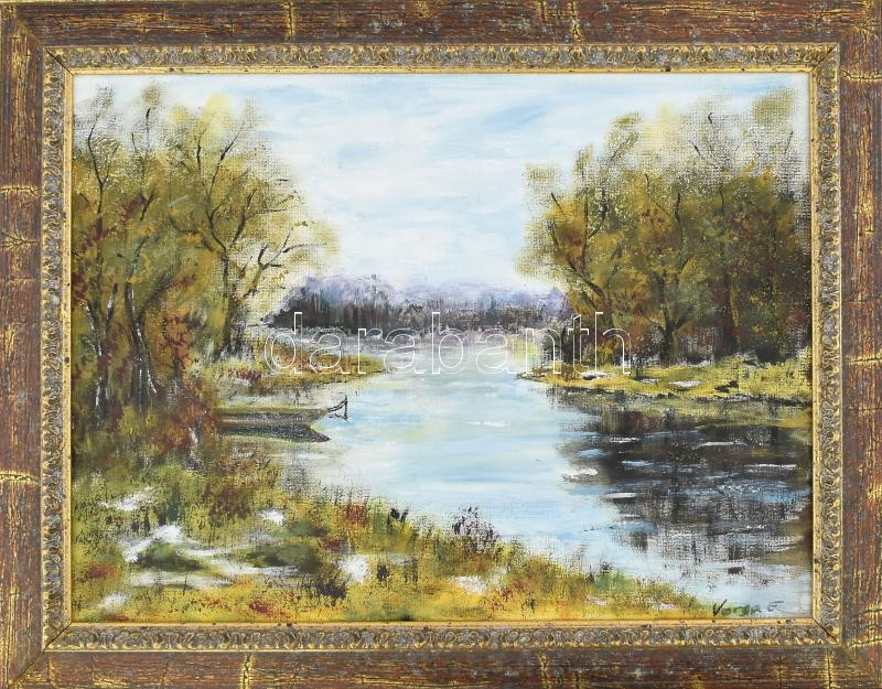 Beschreibung: Varga E jelzéssel: Vízparti táj. Olaj, vászon. 30×40 cm. Dekoratív fakeretben.