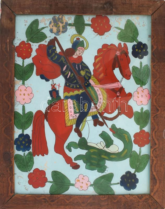 Sárkányölő Szent György. Erdélyi antik festett üvegikon, fakeretben, 4... https://www.darabanth.com/de/475-Fernauktion/475.0/Kunst-Dokumente-andere-Sammelgebiete/Antik~500009/Sarkanyolo-Szent-Gyorgy-Erdelyi-antik-festett-uvegikon-fakeretben-40C39730-cm~II3227953