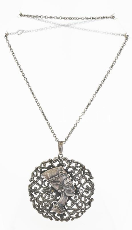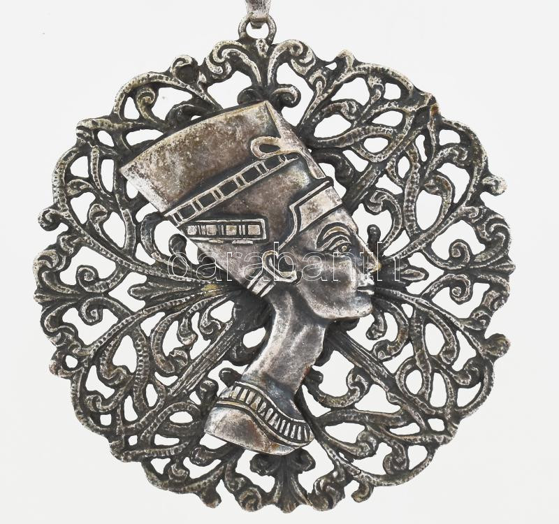 Beschreibung: Nefertiti ábrázolással díszített ezüstözött medál, sérült lánccal, d: 5,5 cm