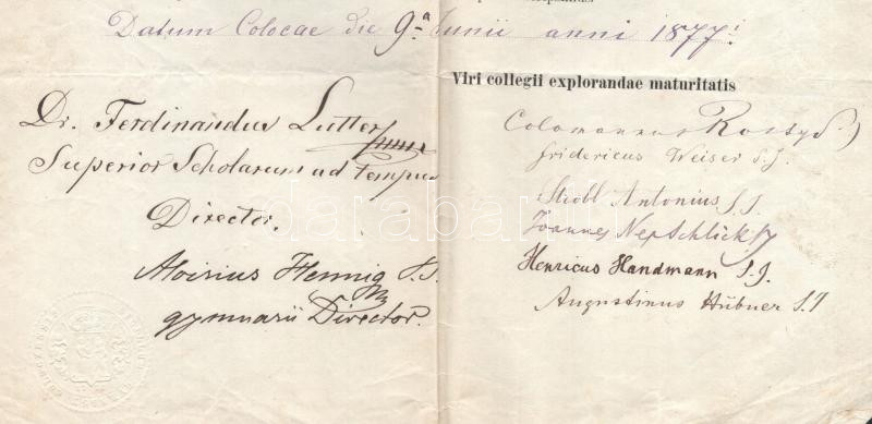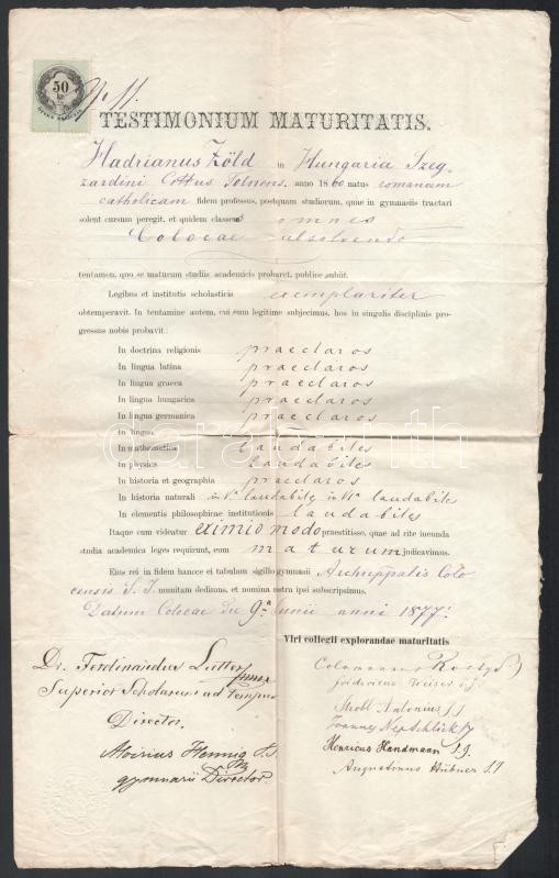 1877 Kalocsa (Colocae), a kalocsai jezsuita kollégium által kiállított, latin nyelvű érettségi bizonyítvány, Lutter Nándor Ferdinánd (1820-1891) budapesti tankerületi vezető, Hennig Alajos (1826-1902) igazgató, Rosty Kálmán (1832-1905) jezsuita áldozópap, költő, tanár, ill. mások aláírásával, 50kr okmánybélyeggel