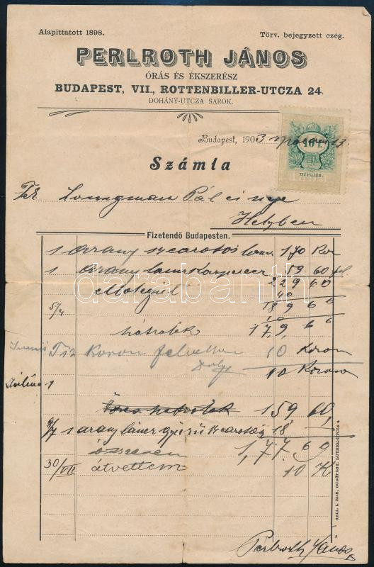 Beschreibung: 1903 Bp., Perlroth János órás és ékszerész (VII., Rottenbiller u. 24.) fejléces számla, 10f okmánybélyeggel, apró szakadásokkal
