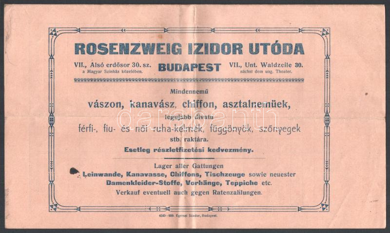 1909 Bp., Rosenzweig Izidor Utóda fejléces számla, össz. 4 oldalas (eb... https://www.darabanth.com/de/475-Fernauktion/475.0/Kunst-Dokumente-andere-Sammelgebiete/Dokument~500021/1909-Bp-Rosenzweig-Izidor-Utoda-fejleces-szamla-ossz-4-oldalas-ebbol-egy-beirt-oldal-2f~II3223404