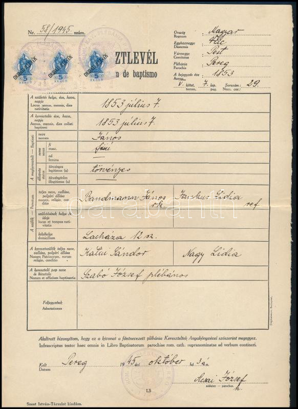 1945 Pereg (Kiskunlacháza), a peregi róm. kat. plébánia által kiállíto... https://www.darabanth.com/de/475-Fernauktion/475.0/Kunst-Dokumente-andere-Sammelgebiete/Dokument~500021/1945-Pereg-Kiskunlachaza-a-peregi-rom-kat-plebania-altal-kiallitott-keresztlevel-3-x-5~II3223488