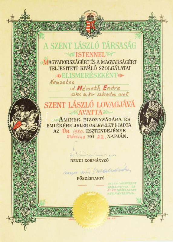 1980 Szent László Társaság, lovaggá avató oklevél a rendi kormányzó és... https://www.darabanth.com/de/475-Fernauktion/475.0/Kunst-Dokumente-andere-Sammelgebiete/Dokument~500021/1980-Szent-Laszlo-Tarsasag-lovagga-avato-oklevel-a-rendi-kormanyzo-es-Kisbarnaki-Farkas-F~II3230437