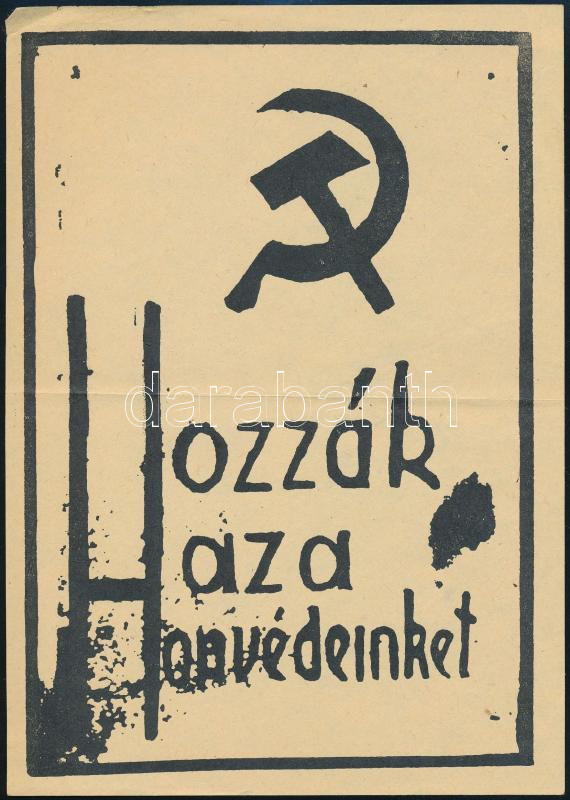 "Hozzák Haza Honvédeinket" röplap, hajtásnyommal, 20,5x14,5 ... https://www.darabanth.com/de/475-Fernauktion/475.0/Kunst-Dokumente-andere-Sammelgebiete/Drucksachen~1000012/Hozzak-Haza-Honvedeinket-roplap-hajtasnyommal-20-5x14-5-cm~II3223059
