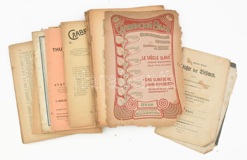 cca 1810-1940 Vegyes szláv nyelvű, vagy vonatkozású nyomtatványok: Bolgár folyóirat, cseh aukciós katalógus, Dechant Cosmas történetíró litografált arcképe