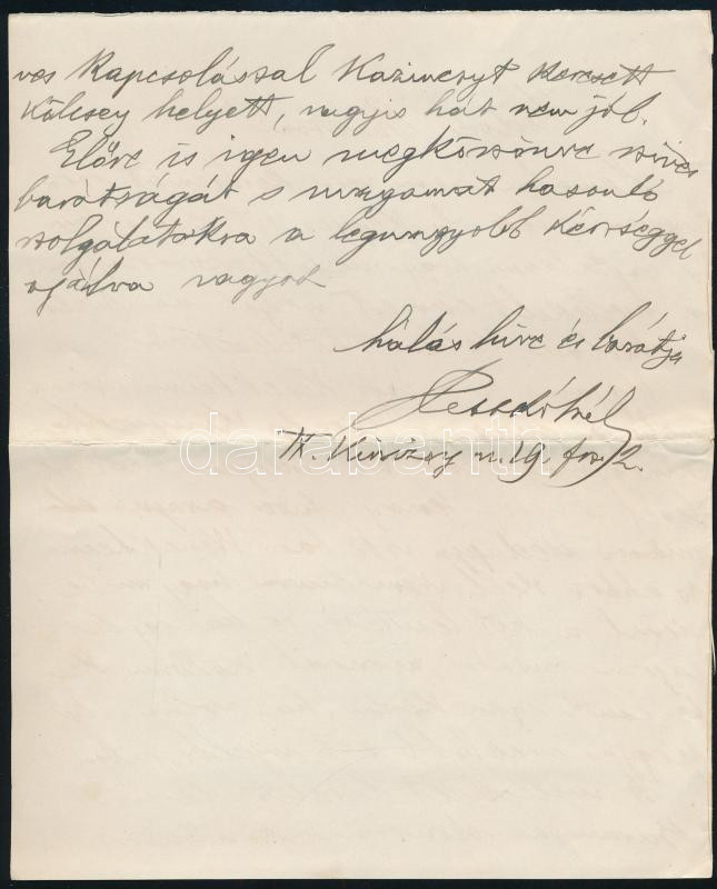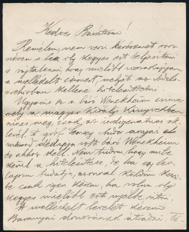 cca 1920 Alsópetőfalvi Pettkó Béla (1862-1942) történész, levéltáros autográf levele a Wenckheim címer vonatkozásában. 2 beírt oldal