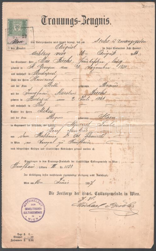 1897 Bécsi izr. hitközség halotti anyakönyvi kivonata https://www.darabanth.com/de/475-Fernauktion/475.0/Kunst-Dokumente-andere-Sammelgebiete/Judaica~1000004/1897-Becsi-izr-hitkozseg-halotti-anyakonyvi-kivonata~II3212597