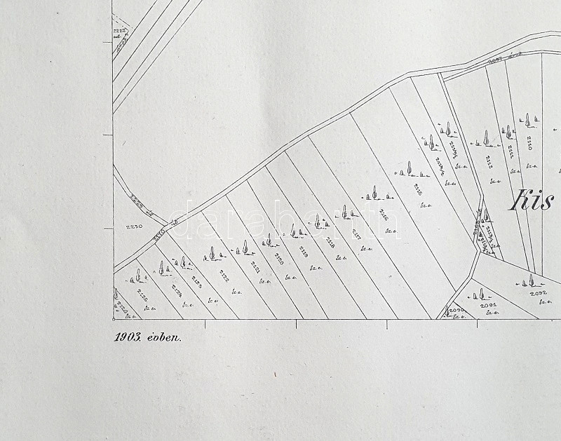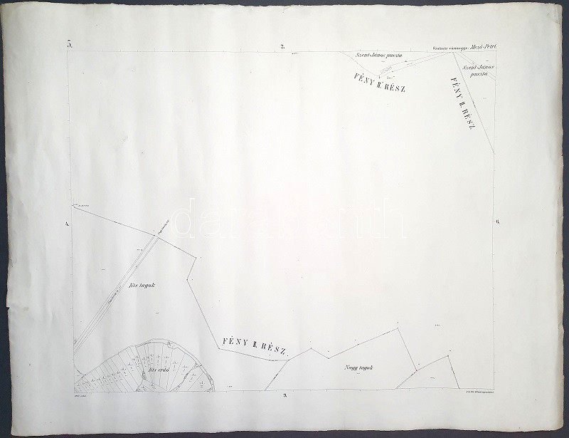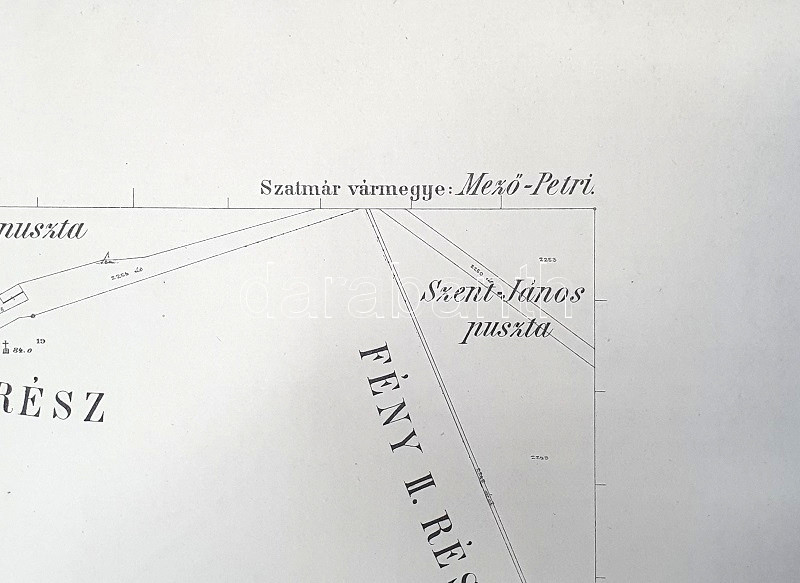 [Térkép] A Szatmár vármegyei Mezőpetri határának tagosítási térképe: Kiserdő és Szentjánospuszta. (1903). [Budapest], 1903. Magyar Királyi Állami Nyomda. Kőnyomat, mérete: 525x655 mm egy 655x865 mm méretű térképlapon. Adózási célból készült, nagy felbontású, hozzávetőlegesen 1: 2850 léptékű kőnyomatú térképünk a Szatmár vármegyei sváb falu, a Nagykároly szomszédságában fekvő Mezőpetri Nagykároly felé eső, északkeleti külterületének dűlőfelosztását mutatja. Térképünkön magassági adatok, utak, illetve a Kiserdőnek nevezett dűlők felosztása, a telek jellemző növényzetének feltüntetésével. A jobb felső sarokban tűnik fel Szent-János puszta területe, rajta a római katolikus kápolnával (a Szent Egyed-kápolnával). Térképünk lajstromszáma a bal felső sarokban, a térkép keretén szelvényszámok, melyeknek segítségével a 16 szelvényből álló teljes Mezőpetri-térképállomány összeállítható. Térképlapunk szélén apró gyűrődések. (Mező-Petri, 5. térkép) Jó állapotú lap.