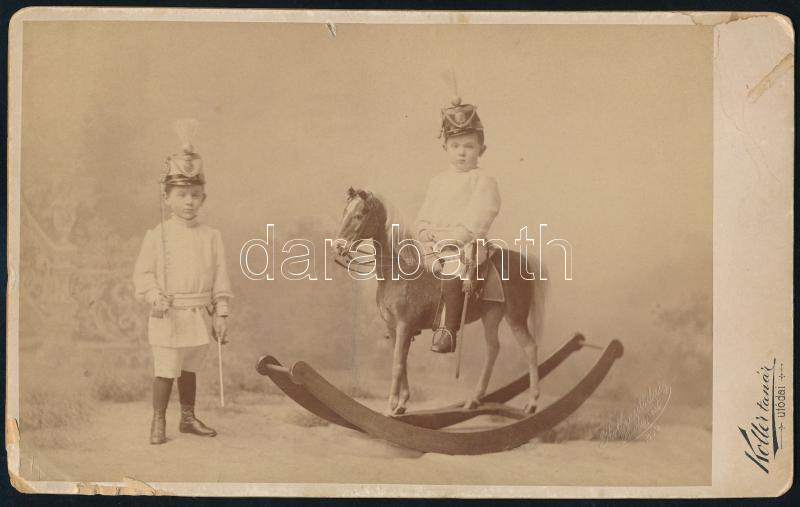 1899 Kisfiúk (játék?) katonai egyenruhában, egyik hintalovon, keményhátú fotó Koller Károly tanár utódai budapesti műterméből, karton széle kissé sérült és kissé foltos, 13x21,5 cm