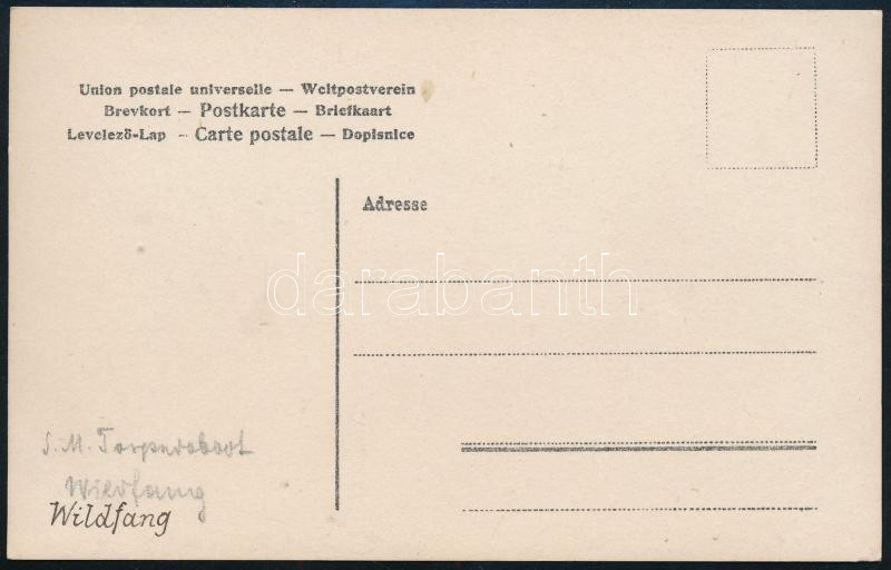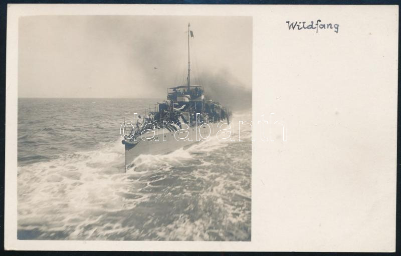 Az S.M.S. Wildfang osztrák-magyar hadihajó. Fotólap / Black-and-white photo postcard showing S.M.S. Wildfang, probably during prewar days, sailing almost straight towards the camera. Officers can be seen in the bridge and two sailors are holding on to cables on the duck-back foredeck.