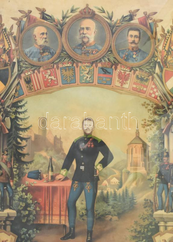 Beschreibung: cca 1890 Szolgálati időm emlékére. Litho emléklap Ferenc József és Rudolf főherceg képével. üvegezett keretben 30x50 cm