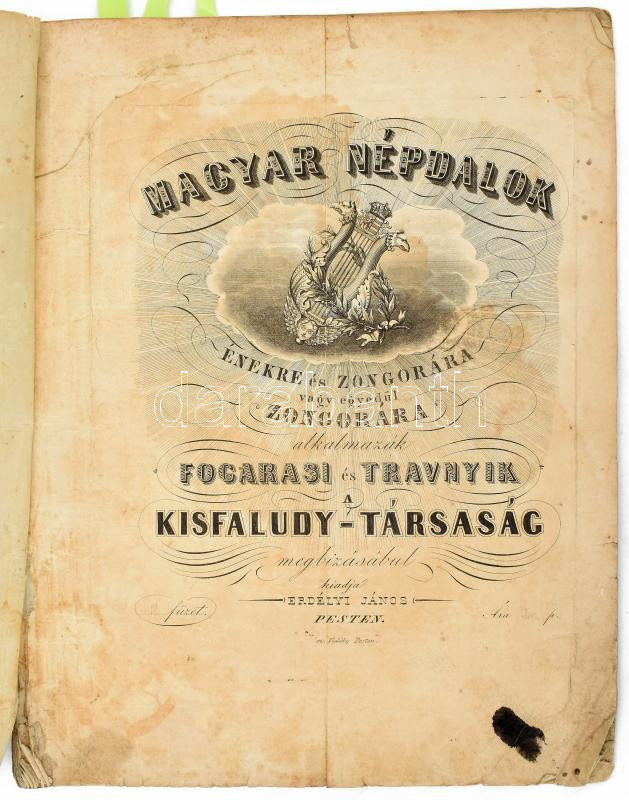 Fogarasi János - Travnyik János: Magyar népdalok. 2. füzet. Énekre és zongorára vagy egyedül zongorára alkalmazzák Fogarasi és Travnyik a Kisfaludy-Társaság megbizásábul. Hozzákötve: Csikós dalai zongorára. Hozzákötve: Fogarasi János - Travnyik János: Magyar népdalok. 2. füzet. Énekre és zongorára vagy egyedül zongorára alkalmazzák Fogarasi és Travnyik a Kisfaludy-Társaság megbizásábul. Pesten, én. (1846-1847.,) Erdélyi János - Treichlinger J.,7-8+3-6+13+(3)+1-11+1;+1-3+1+;1-2+9-12+7+1 p. A címlapokat Vidéky [Károly](1800-1882) metszette. Papírkötésben, pár lapon javítás, foltos, szakadt borítóval, foltos lapokkal, a lapok egy részén sérülésekkel, hiányos. Egykorú névbejegyzésekkel (Andresz Péter.)