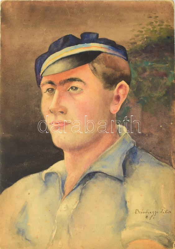 Beschreibung: Bánhegyi Tibor (1923-1986): Munkás (plakátterv), 1946-1947 körül. Akvarell, karton, jelzett, sarkaiban kissé sérült, 43,5×31 cm