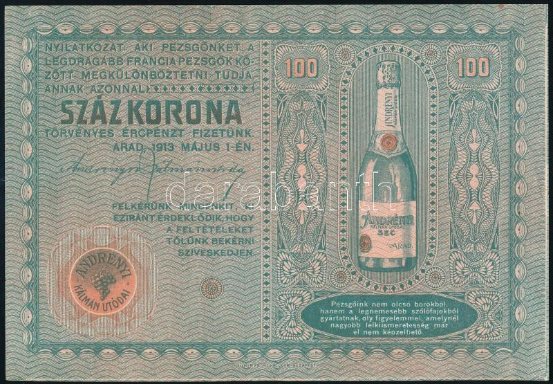 1913. 100 Koronás bankjegy mintájára készült jegyzéklap, Andrényi Kálm... https://www.darabanth.com/de/475-Fernauktion/475.0/Kunst-Dokumente-andere-Sammelgebiete/Werbungen~1000001/1913-100-Koronas-bankjegy-mintajara-keszult-jegyzeklap-Andrenyi-Kalman-utodai-Arad-sze~II3214165