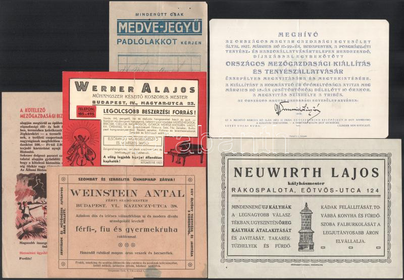 cca 1930-40 6 db reklámnyomtatvány, izraelita férfiszabó, Werner Alajo... https://www.darabanth.com/de/475-Fernauktion/475.0/Kunst-Dokumente-andere-Sammelgebiete/Werbungen~1000001/cca-1930-40-6-db-reklamnyomtatvany-izraelita-ferfiszabo-Werner-Alajos-hangszer-Medve-padlola~II3226232