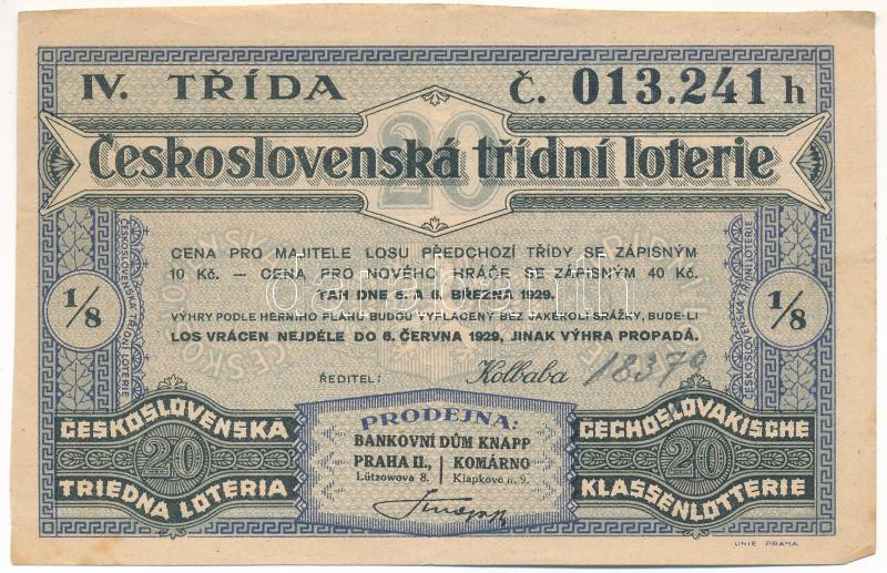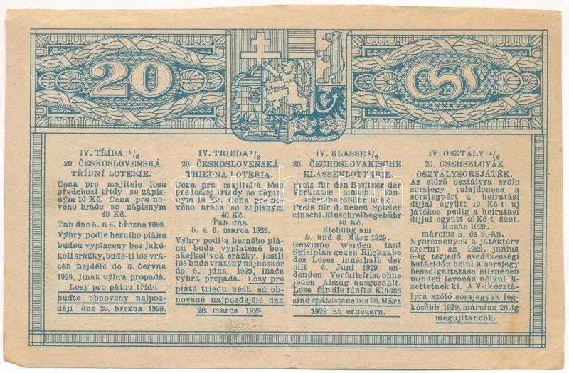 Csehszlovákia 1929. "20. Csehszlovák Osztálysorsjáték" negye... https://www.darabanth.com/de/475-Fernauktion/475.0/Numismatik/Aktien-und-Tickets~2000007/Csehszlovakia-1929-20-Csehszlovak-Osztalysorsjatek-negyedik-osztaly-18-ad-sorsjegye-BAN~II3206993