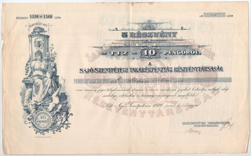 Sajószentpéter 1927. "Sajószentpéteri Takarékpénztár Részvénytárs... https://www.darabanth.com/de/475-Fernauktion/475.0/Numismatik/Aktien-und-Tickets~2000007/Sajoszentpeter-1927-Sajoszentpeteri-Takarekpenztar-Reszvenytarsasag-reszvenye-10P-rC5~II3137096