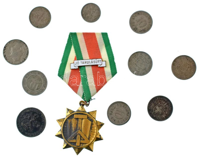 10db-os vegyes külföldi fémpénz tétel, közte Belgium, Olaszország, Csehszlovákia + "Jó tanulásért" aranyozott bronz és zománcozott bronz jelvény mellszalagon T:vegyes