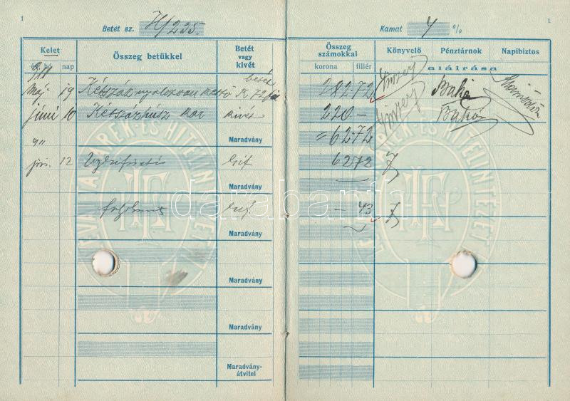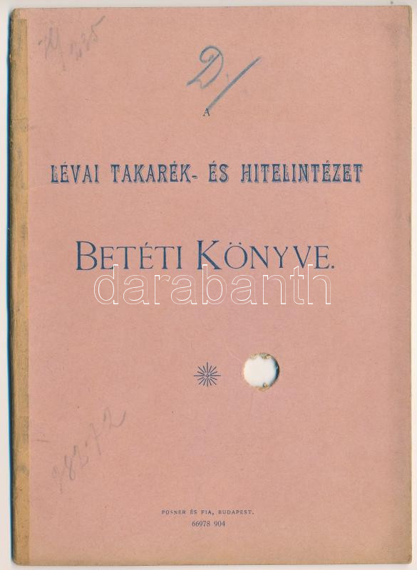 Beschreibung: Budapest 1911. "Lévai Takarék-és Hitelintézet" betéti könyve, bejegyzésekkel, lyukasztással érvénytelenítve.