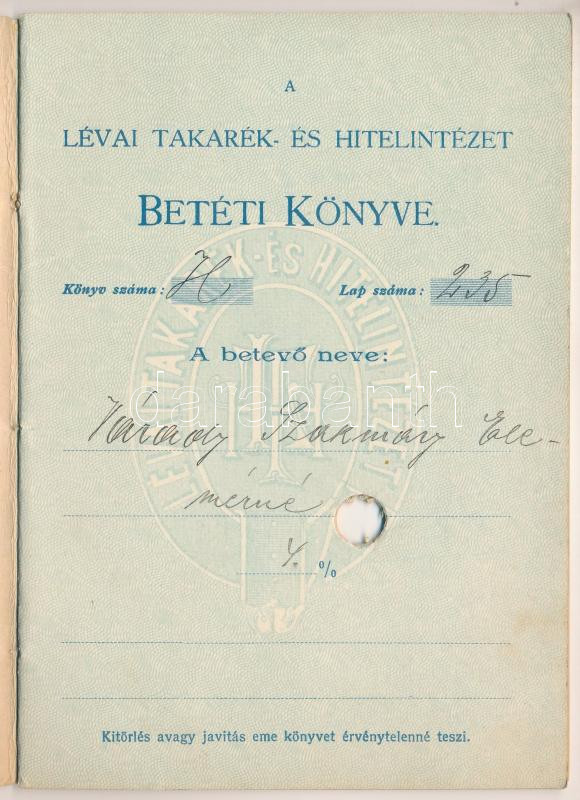 Budapest 1911. "Lévai Takarék-és Hitelintézet" betéti könyve... https://www.darabanth.com/de/475-Fernauktion/475.0/Numismatik/Numismatische-Dokumente-und-Briefe~2000005/Budapest-1911-Levai-Takarek-es-Hitelintezet-beteti-konyve-bejegyzesekkel-lyukasztassal-~II3223473