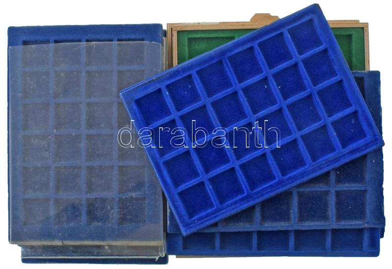 Tizenöt darab, erősen használt állapotú érmetartó tálca, összesen 280 férőhellyel (3x12, 3x24, 2x20, 48m 3x12 és kétéremtartó kazetta felosztásban), különböző méretű fészkekkel