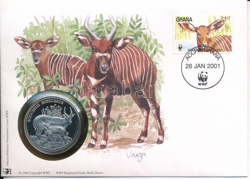 Ghána DN (1991) "A Világ Vadvédelmi Alap (WWF) 30. évfordulója - Boocerus Eurycerus (Bongó)" kétoldalas fém emlékérem érmés borítékban, bélyeggel és bélyegzéssel, német nyelvű ismertetővel T:PP Ghana ND (1991) "30th Anniversary of the World Wildlife Fund - Boocerus Eurycerus" two-sided metal commemorative medallion in envelope with stamp and cancellation, with German description C:PP