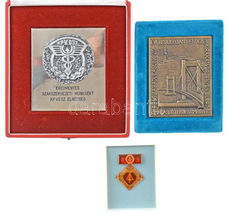 Beschreibung: 1965. "Felszabadulásunk 20. évfordulóján rendezett kirakatversenyen elért kimagasló teljesítményért" egyoldalas öntött bronz plakett (73x95mm) + ~1980. "KPVDSZ (Kereskedelmi, Pénzügyi és Vendéglátó-ipari Dolgozók Szakszervezete) Eredményes szakszervezeti munkáért KPVDSZ Elnökség" fém emlékérem (60mm) fém lapra ragasztva (105x90mm) + NDK ~1970. műgyantás szocialista kitüntető jelvény műanyag tokban T:AU,XF