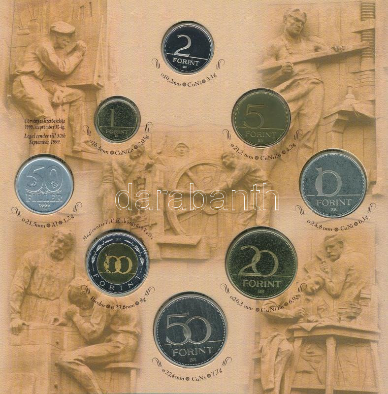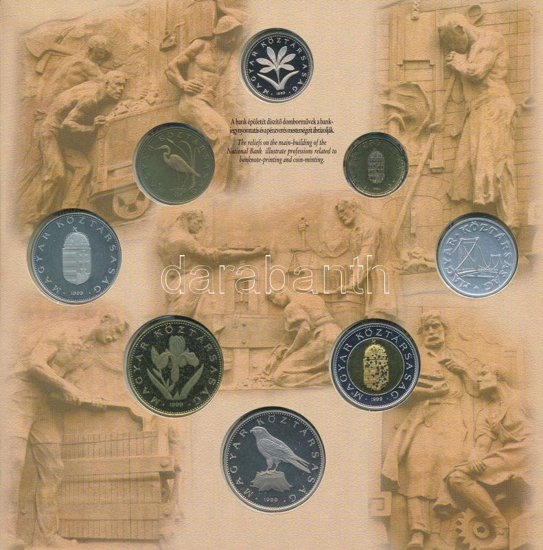1999. 50f-100Ft (8xklf) "75 éves a Magyar Nemzeti Bank" forg... https://www.darabanth.com/de/475-Fernauktion/475.0/Numismatik/Ungarische-Kursmunzsatze~2000011/1999-50f-100Ft-8xklf-75-eves-a-Magyar-Nemzeti-Bank-forgalmi-sor-disztokban-TPP-patina--Adam~II3160019
