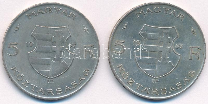 1947. 5Ft Ag "Kossuth" (2x) T:VF,F patina Adamo F8.1 https://www.darabanth.com/de/475-Fernauktion/475.0/Numismatik/Ungarische-Munzen-und-Munzen-mit-ungarischem-Munzzeichen~2000010/1947-5Ft-Ag-Kossuth-2x-TVF-F-patina-Adamo-F81~II3229106