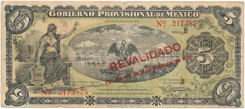 Mexico / Gobierno Provisional de México 1914. 5 Pesos with red "REVALIDADO" overprint C:F,VG spot, pinholes