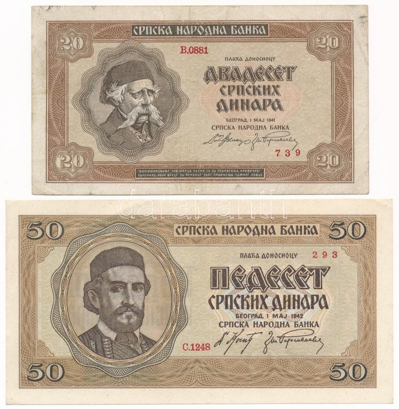 Szerbia / Német megszállás 1941. 20D + 1942. 50D T:F,XF Serbia / Germa... https://www.darabanth.com/de/475-Fernauktion/475.0/Numismatik/Weltweit-Banknoten~2000016/Szerbia-Nemet-megszallas-1941-20D-plus-1942-50D-TF-XF-Serbia-German-Occupation-1941-20-Dinar~II3207344