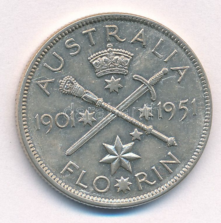 Australia 1... https://www.darabanth.com/de/475-Fernauktion/475.0/Numismatik/Weltweit-Munzen~2000017/Ausztralia-1951-1Fl-Ag-50-eves-jubileum-TXF-Australia-1951-1-Florin-Ag-50th-year-jubilee-C~II3229085